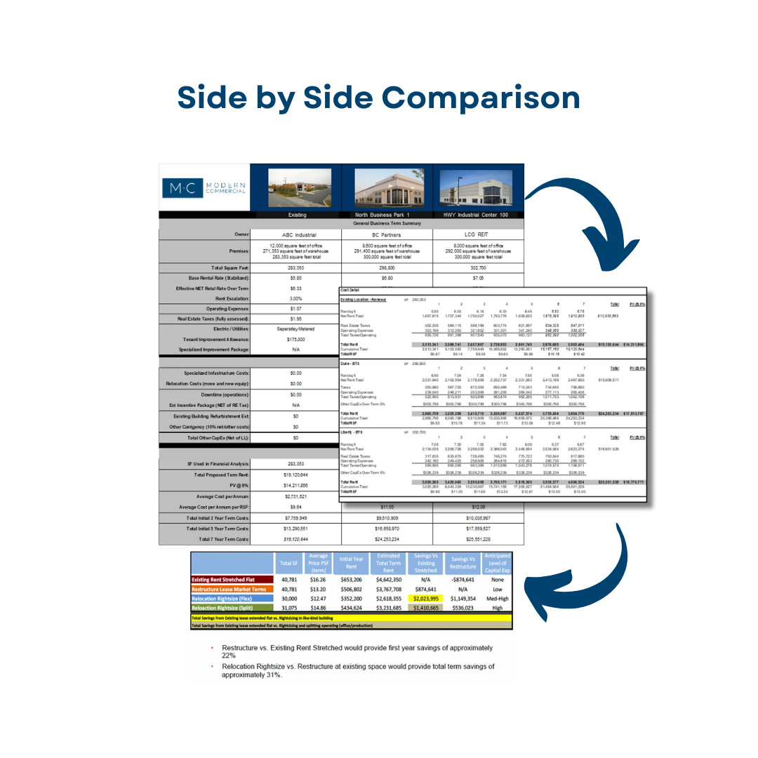 Side-by-Side Comparisons: Compare existing facilities with new alternatives—highlighting cost, space layout, and growth potential. Attack expenses & future costs.